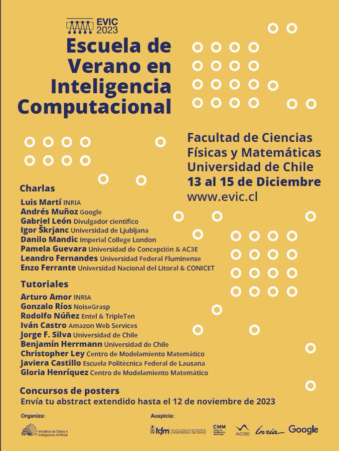 EVIC 2023 es organizada por la Iniciativa de Datos e Inteligencia Artificial de la Universidad de Chile y es auspiciada por el Capítulo Chileno IEEE-CIS, el Centro de Modelamiento Matemático (CMM), Inria-Chile, y por el Centro Avanzado de Ingeniería Eléctrica y Electrónica (AC3E).