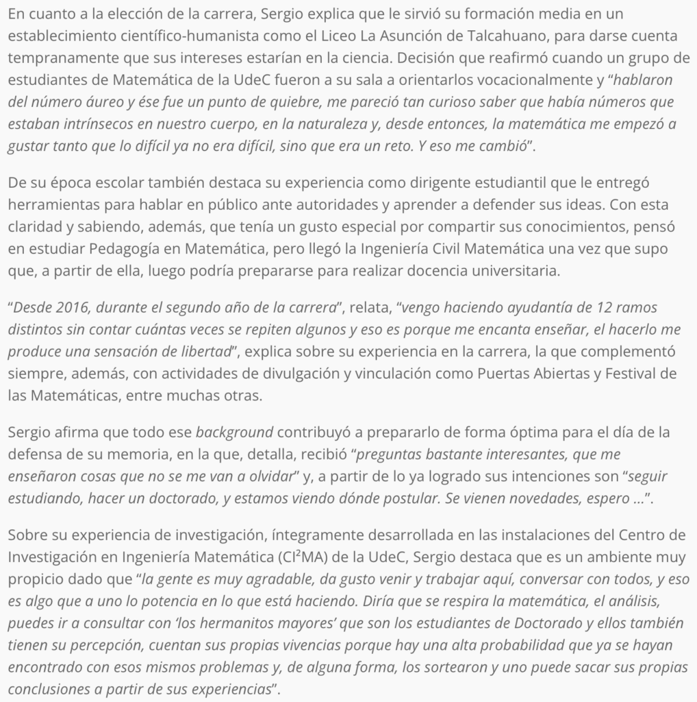 En cuanto a la elección de la carrera, Sergio explica que le sirvió su formación media en un establecimiento científico-humanista como el Liceo La Asunción de Talcahuano, para darse cuenta tempranamente que sus intereses estarían en la ciencia. Decisión que reafirmó cuando un grupo de estudiantes de Matemática de la UdeC fueron a su sala a orientarlos vocacionalmente y “hablaron del número áureo y ése fue un punto de quiebre, me pareció tan curioso saber que había números que estaban intrínsecos en nuestro cuerpo, en la naturaleza y, desde entonces, la matemática me empezó a gustar tanto que lo difícil ya no era difícil, sino que era un reto. Y eso me cambió”.