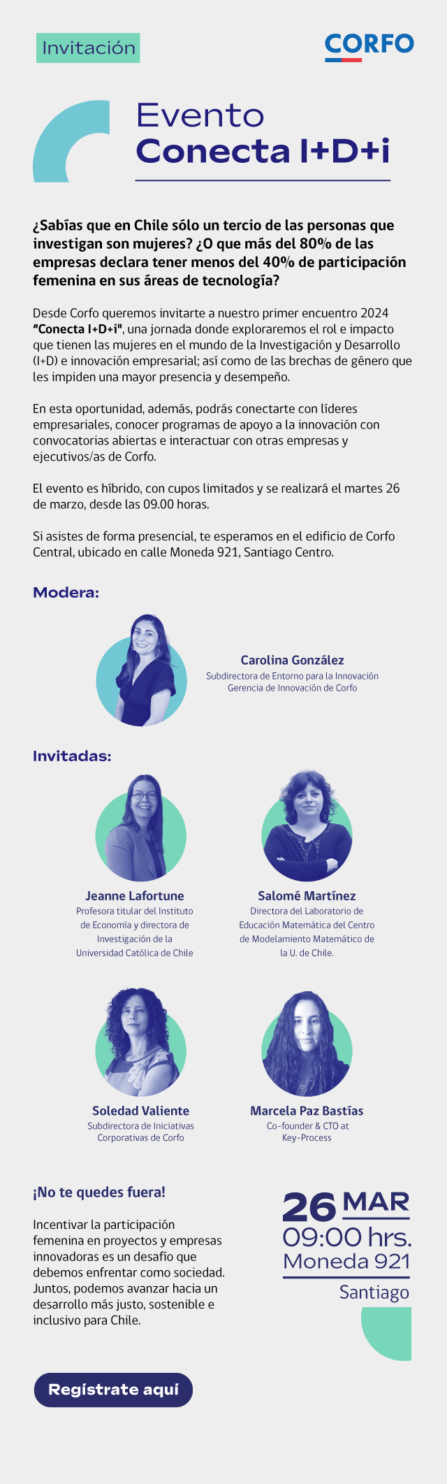 Corfo invita al primer encuentro 2024 “Conecta I+D+i”, jornada donde se explorará el rol e impacto que tenemos las mujeres en el mundo de la Investigación y Desarrollo (I+D) e innovación empresarial, así como el de las brechas de género que nos impiden una mayor presencia y desempeño.