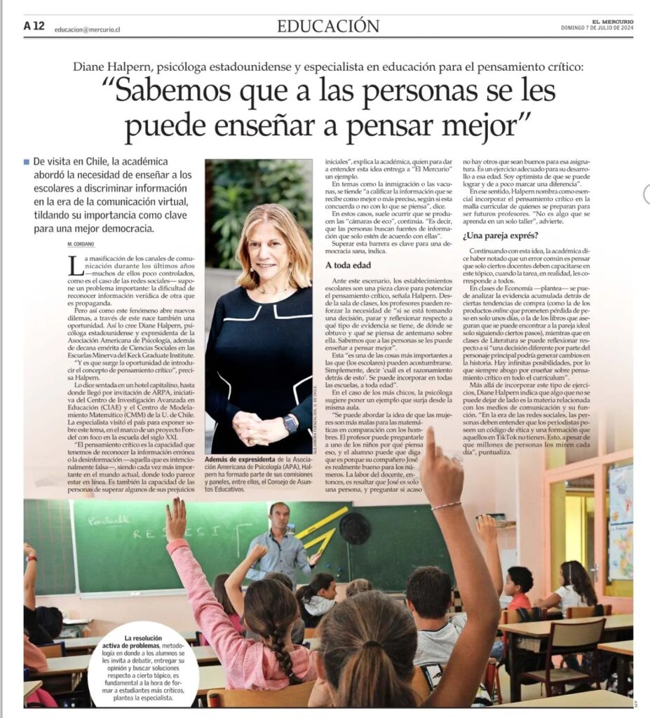 La psicóloga estadounidense y especialista en educación para el pensamiento crítico visitó Chile por invitación de ARPA, iniciativa del Centro de Investigación Avanzada en Educación (CIAE) y el Centro de Modelamiento Matemático (CMM) de la U. de Chile.