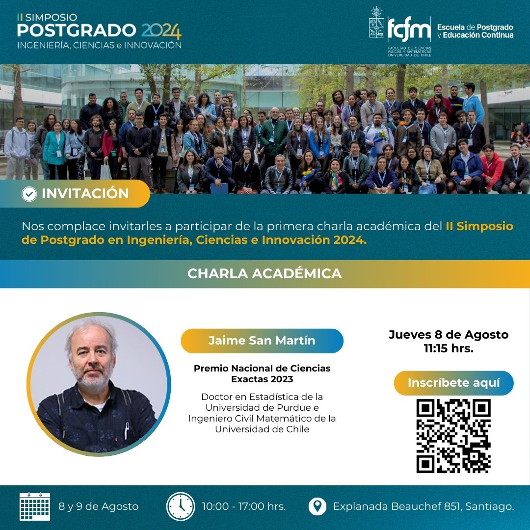 Los días 8 y 9 de agosto se realizará el II Simposio de Postgrado, en modalidad sesión de “Posters” y “Tesis en 1 minuto”. Esta actividad se realizará en la Explanada de Beauchef 851, Santiago, donde dictarán charlas los investigadores CMM Jaime San Martín y Héctor Ramírez.