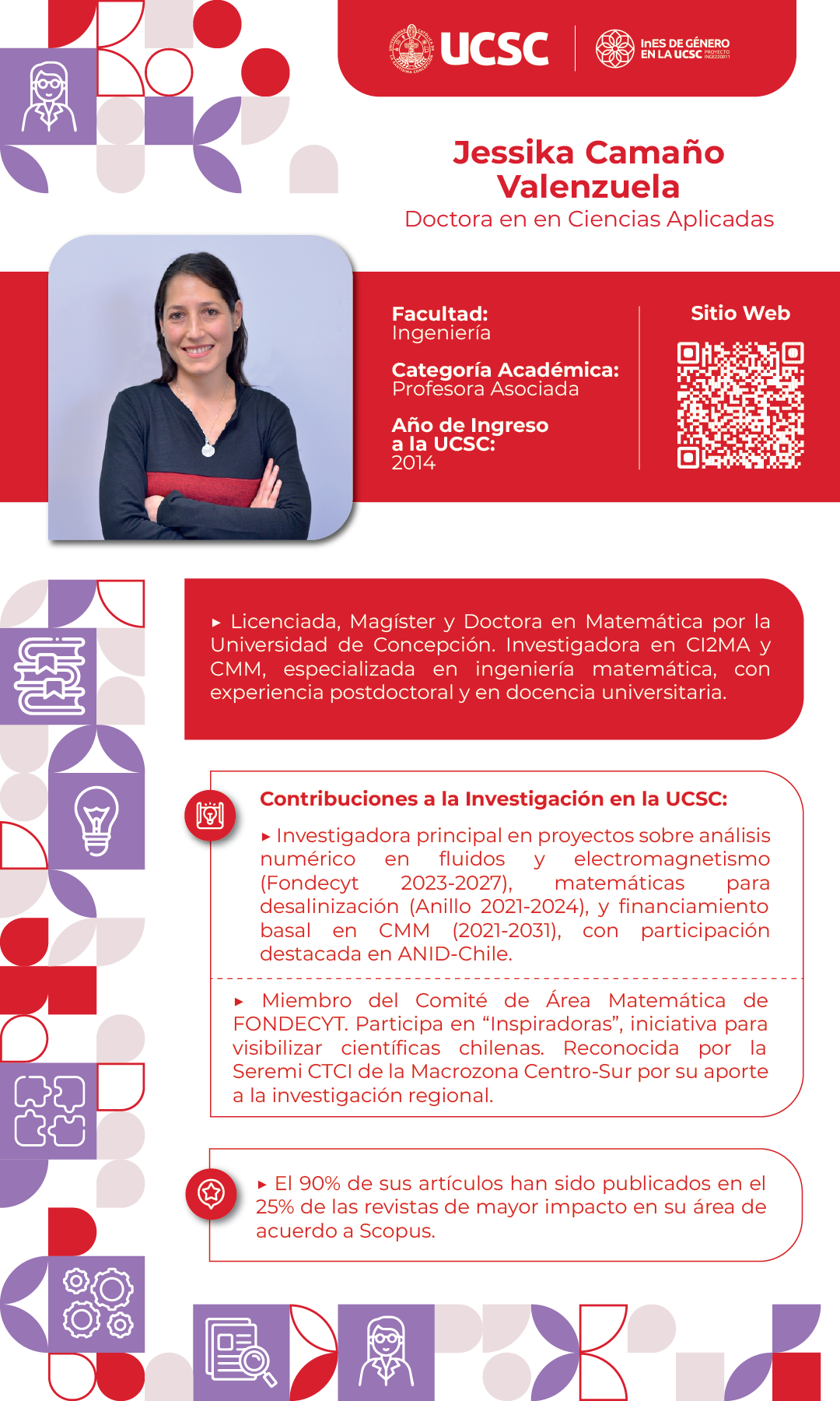 Para ello, se inauguró el hall de reconocimiento ‘Mujeres Impulsoras de Ciencia y Conocimiento en la UCSC’, que está ubicado en el exterior de su Biblioteca Central y destaca su valioso aporte en sus respectivas áreas. Una de las homenajeadas es la Dra. Jessika Camaño Valenzuela, académica del Departamento de Física y Matemática Aplicadas de la Facultad de Ingeniería de esa casa de estudios e investigadora del Centro de Modelamiento Matemático (CMM) de la Universidad de Chile.