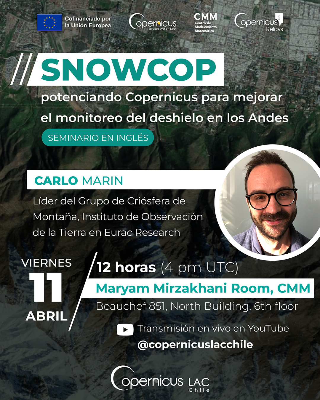 En el seminario se mostrará cómo SNOWCOP aprovecha el potencial del programa Copernicus integrando sus abundantes flujos de datos en un enfoque innovador de reconstrucción de nieve. Además, se destacará el papel crucial del Ecosistema del Espacio de Datos de Copernicus (CDSE) en el procesamiento eficiente y a gran escala de estos datos. Esto permitirá generar mapas diarios sin precedentes, de alta resolución (50 m), sobre la cantidad de agua equivalente en nieve (SWE) y las tasas de deshielo en los Andes extratropicales, cubriendo un periodo de más de dos décadas.