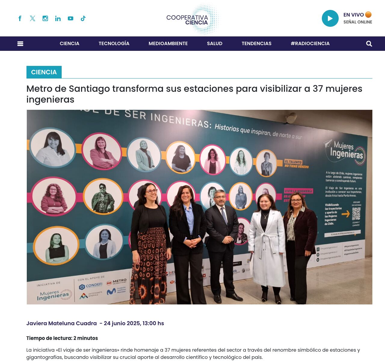 “La iniciativa «El viaje de ser ingenieras» rinde homenaje a 37 mujeres referentes del sector a través del renombre simbólico de estaciones y gigantografías, buscando visibilizar su crucial aporte al desarrollo científico y tecnológico del país”, destaca el medio nacional.