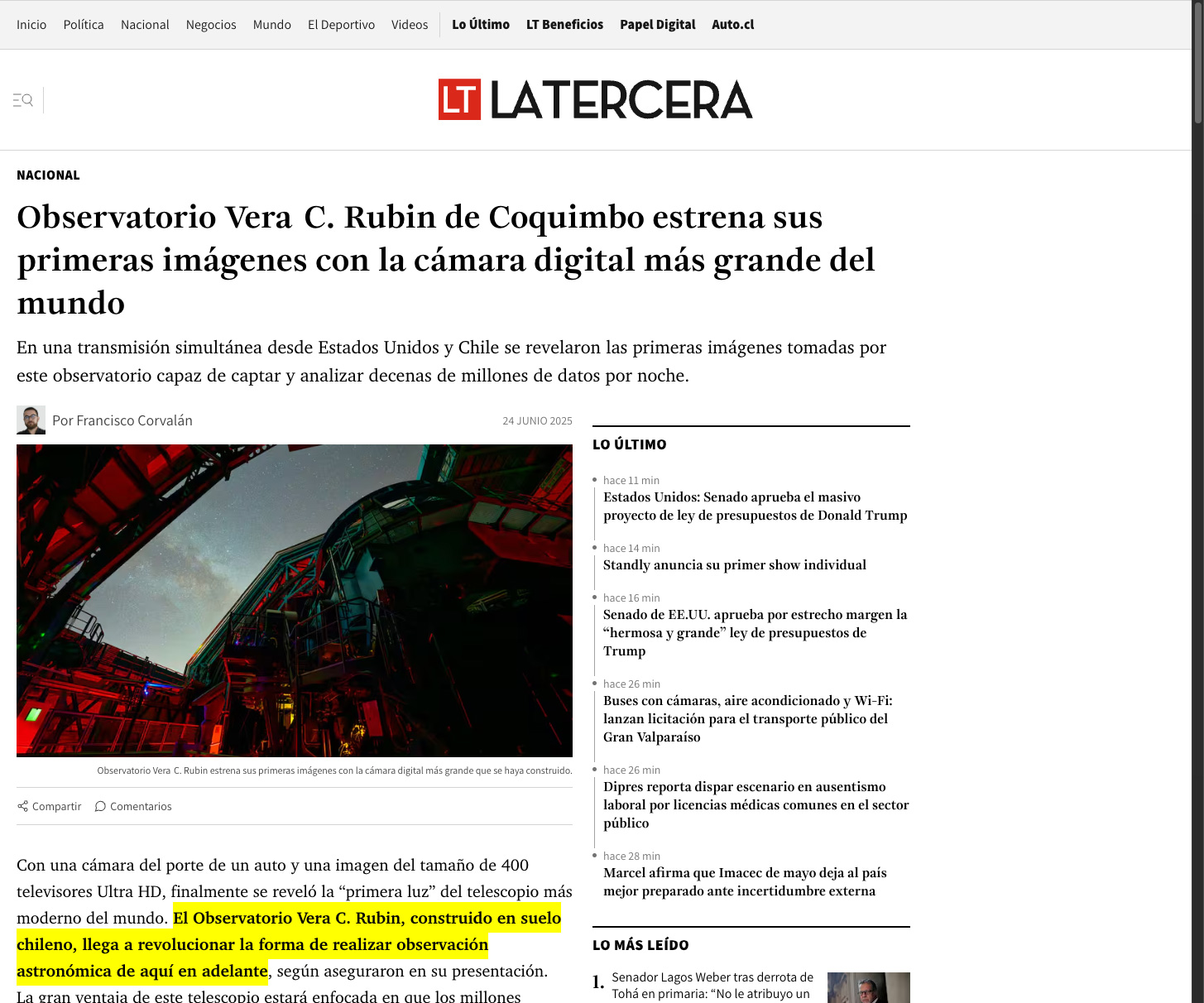 «En una transmisión simultánea desde Estados Unidos y Chile se revelaron las primeras imágenes tomadas por este observatorio capaz de captar y analizar decenas de millones de datos por noche», destaca el medio nacional en su edición digital.