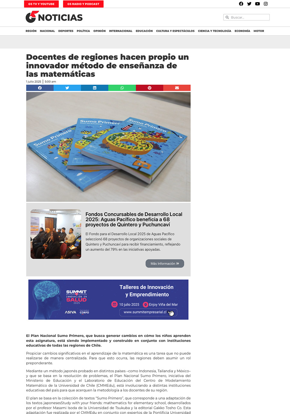 «El Plan Nacional Sumo Primero, que busca generar cambios en cómo los niños aprenden esta asignatura, está siendo implementado y construido en conjunto con instituciones educativas de todas las regiones de Chile», destaca el medio digital.