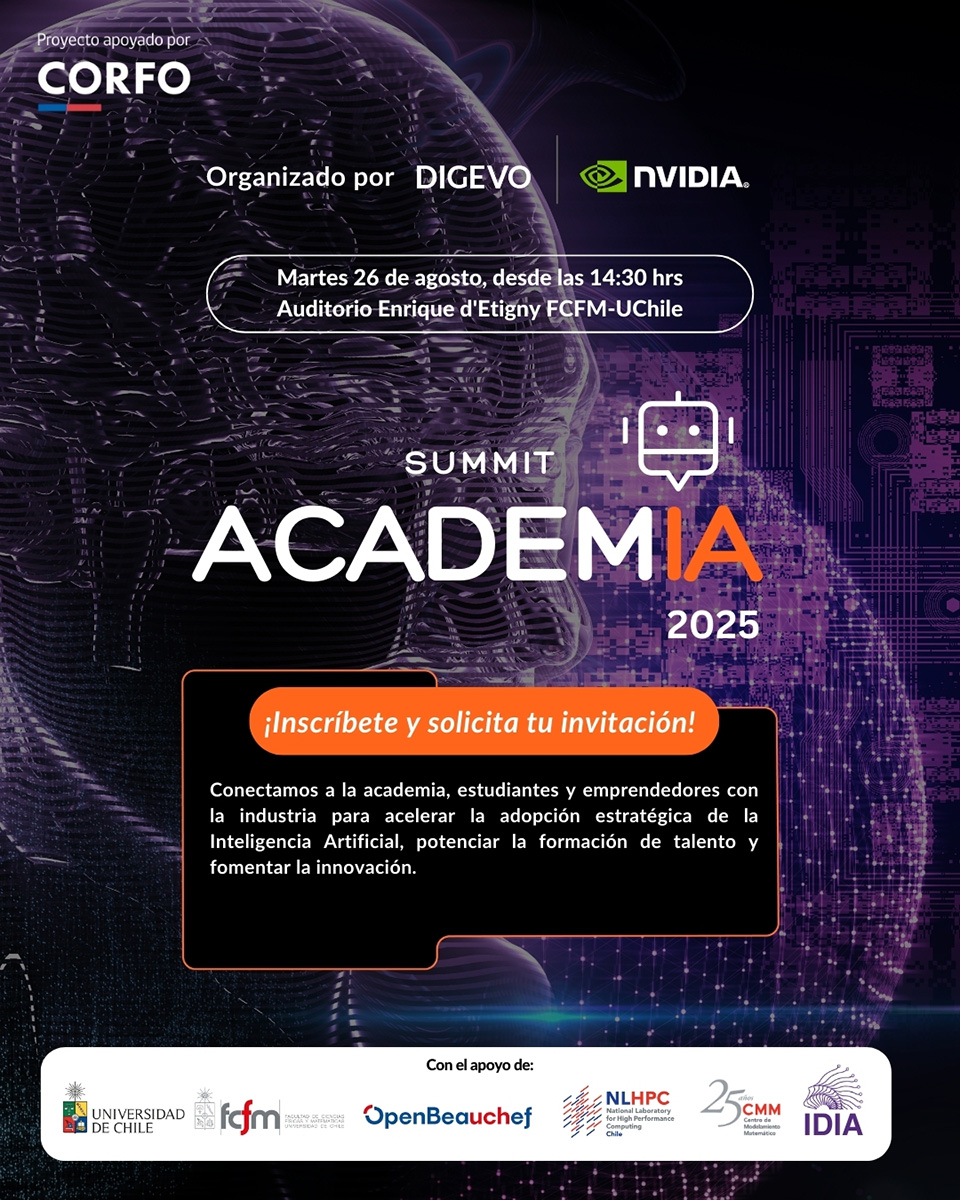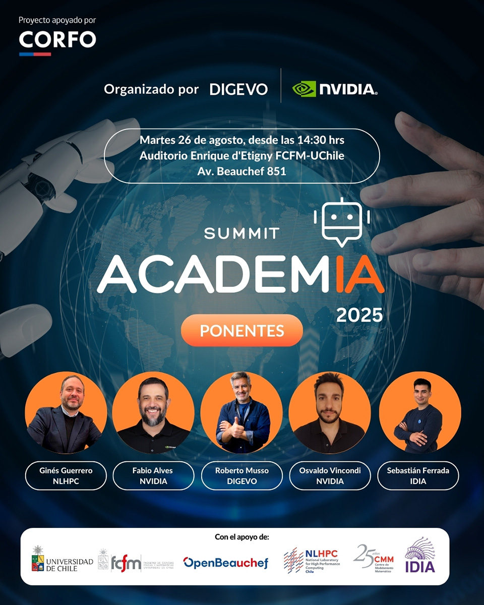 Este evento, organizado por CORFO Metropolitano, Digevo Ventures, NVIDIA, el Laboratorio Nacional de Computación de Alto Rendimiento (NLHPC) y OpenBeauchef, reúne a la academia, estudiantes y emprendedores con el sector productivo, para impulsar la adopción estratégica de la Inteligencia Artificial, potenciar la formación de talento y fomentar la innovación desde el ámbito universitario.