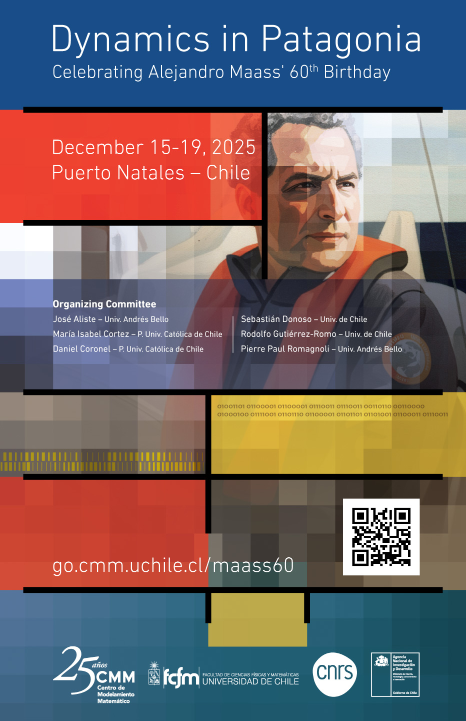 We are delighted to announce Dynamics in Patagonia, an international conference honoring our esteemed colleague Alejandro Maass on the occasion of his 60th birthday. This event will bring together leading researchers, early-career scholars, and students from around the globe to celebrate Alejandro’s profound contributions to dynamical systems and ergodic theory, as well as his significant influence on the development of dynamics in Latin America.