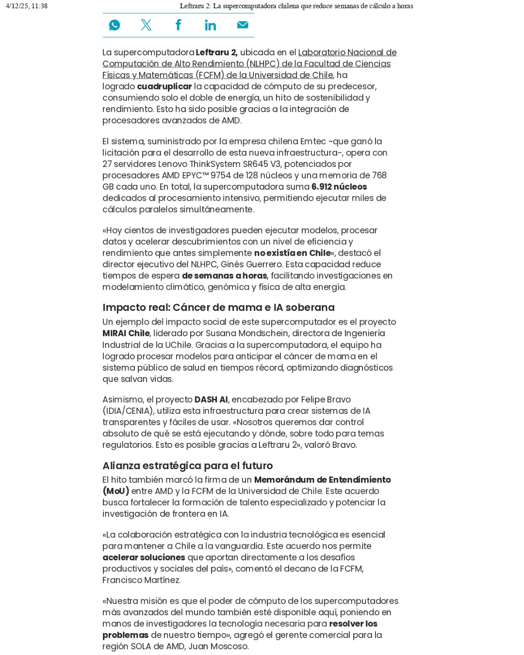El medio Cooperativa Ciencia publicó un reportaje sobre la reciente puesta en marcha de Leftraru 2, la supercomputadora instalada en el Laboratorio Nacional de Computación de Alto Rendimiento (NLHPC) del Centro de Modelamiento Matemático (CMM) de la Universidad de Chile. La nota subraya el salto tecnológico y energético que representa esta nueva infraestructura para la investigación científica del país.