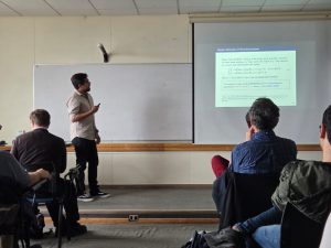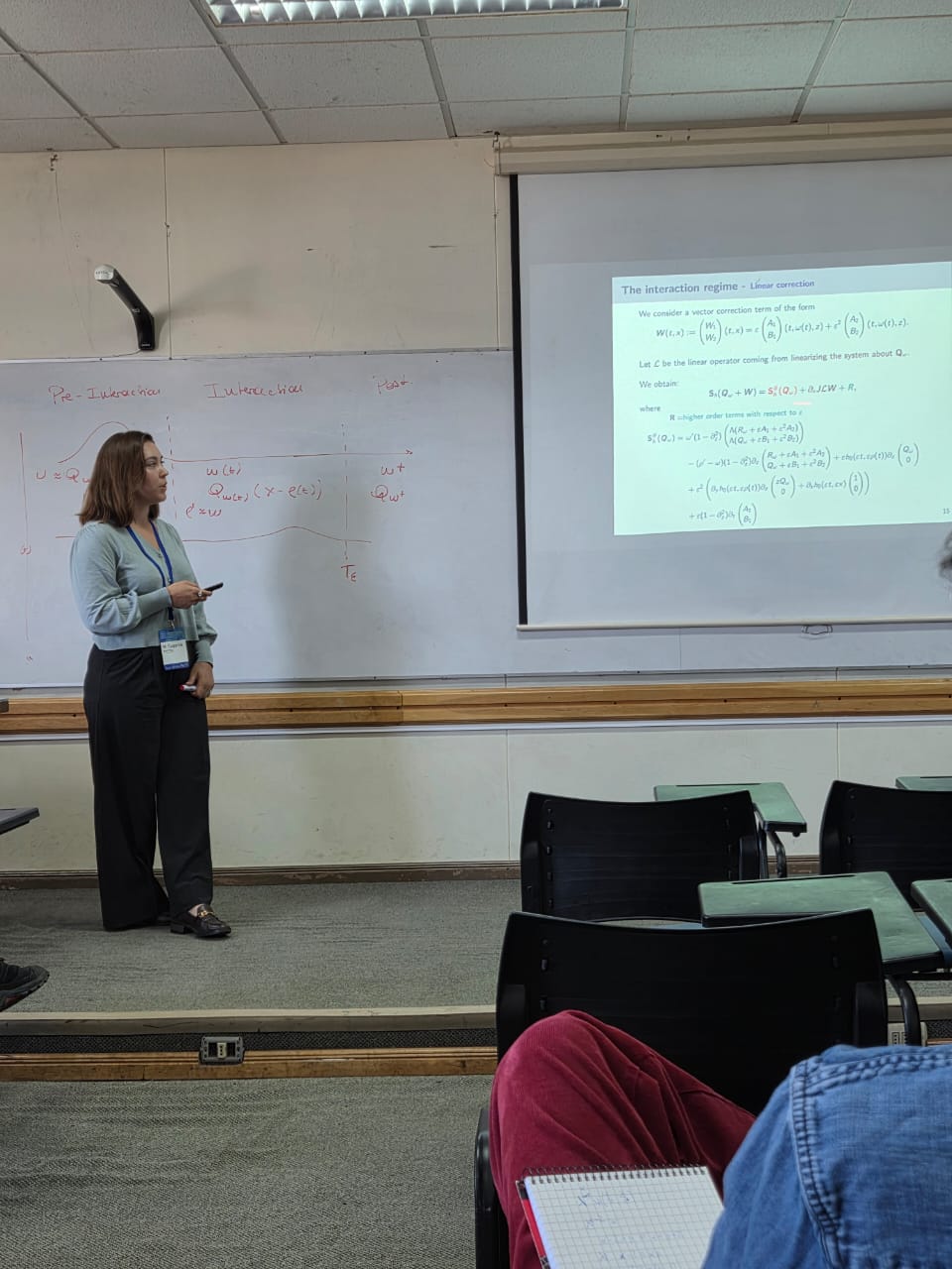 Por su parte, el investigador postdoctoral de la Universidad de Chile Ricardo Freire presentó “On the asymptotic dynamics for the L2-supercritical gKDV equation”, donde estudia el comportamiento asintótico de soluciones de la ecuación generalizada de Korteweg–de Vries en el régimen supercrítico. Su trabajo entrega una descripción unificada de la región no solitónica, tanto para soluciones globales como para aquellas que presentan blow-up, introduciendo nuevas herramientas analíticas que permiten obtener estimaciones cuantitativas de decaimiento sin requerir hipótesis de cercanía a solitones.